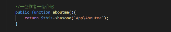 - 下面的function要寫上aboutme與user的關係,hasone(‘App\Aboutme’);